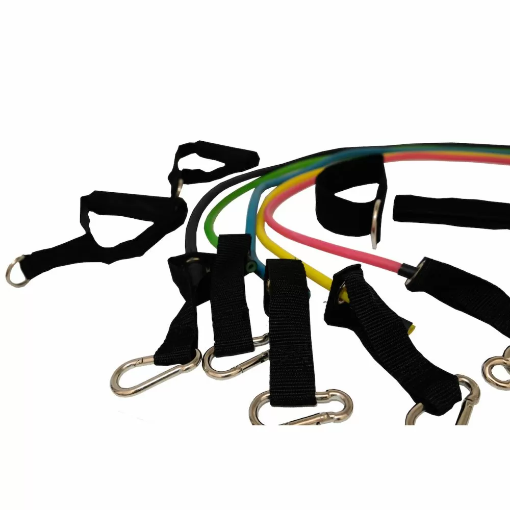 -set sadrzi 9 delova i 5 guma razlicite rastegljivosti (jacine), 1 set rucki (rukohvata ) koji se lako kace na odgovarajucu gumu,2 gurtne za noge i platnenu kesu za nosenje