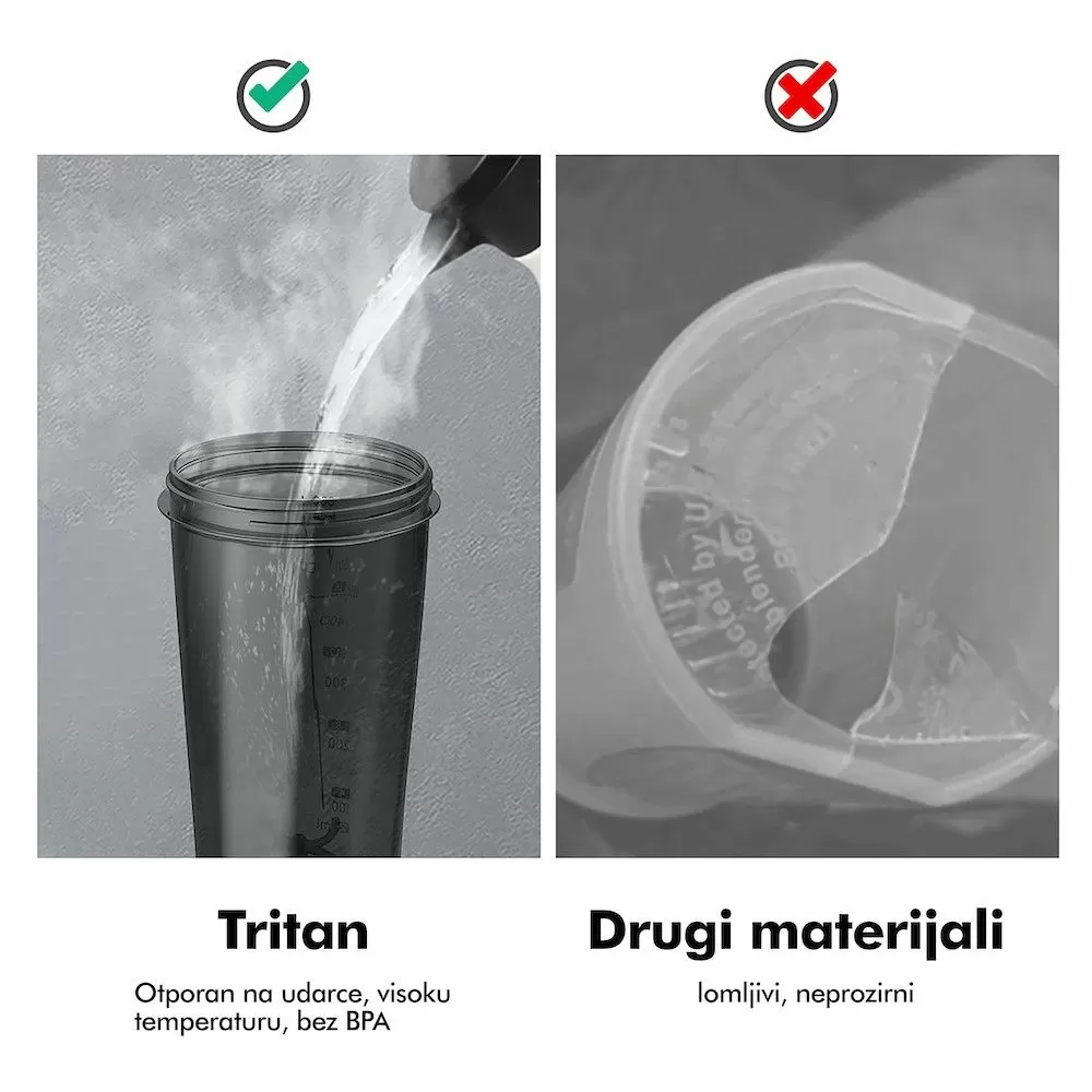 Zdravstveno bezbedan: Naš šejker je izrađen od materijala vrhunskog kvaliteta, potpuno bezbednih za upotrebu. Tritan plastika od koje je napravljen ne sadrži BPA niti BPS, što ga čini sigurnim za svakodnevnu upotrebu, i bezbedna čak i za bebe. Ovaj materijal ispunjava najstrože standarde zdravstvene bezbednosti, I takodje je odobren od FDA americke zdravstvene organizacije