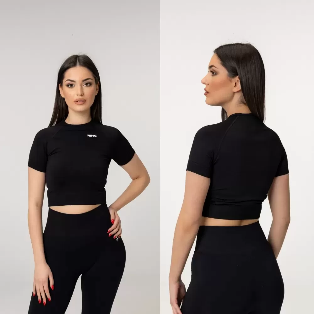 RING Active crop top je moderna sportska majica srednje dužine sa kratkim rukavima, dizajnirana za maksimalnu udobnost i slobodu pokreta tokom treninga i svakodnevnih aktivnosti. Zahvaljujući zatvorenijem, minimalističkom dizajnu, pruža osećaj sigurnosti i stabilnosti, dok istovremeno zadržava moderan sportski izgled.